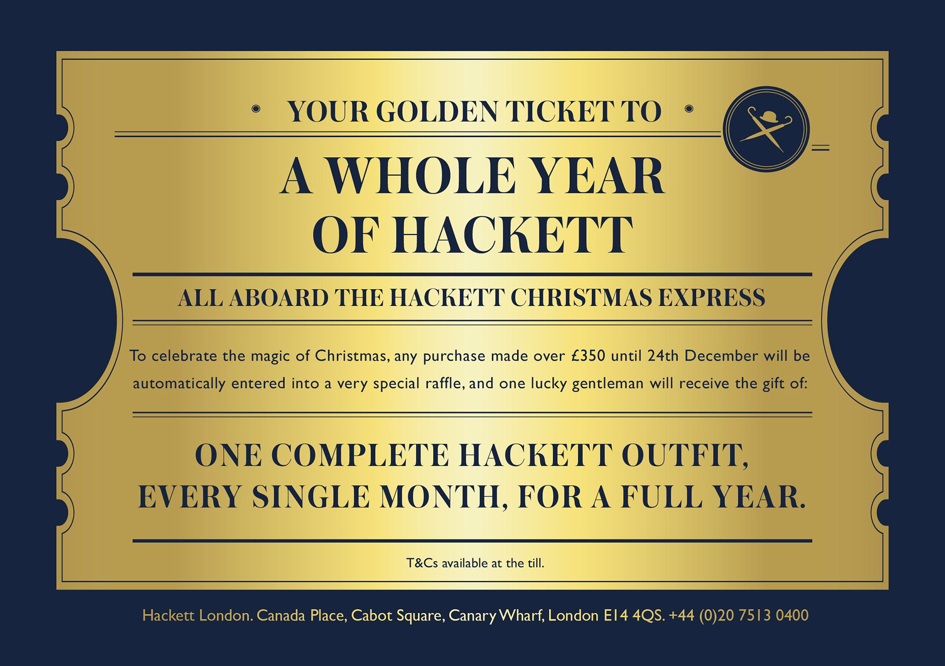 To celebrate the magic of Christmas (2019) the Hackett London marketing team delivered a store-traffic initiative where I executed the development of an idea from concept to completion and distribution of a global-wide raffle for an opportunity to win a can't-miss Hackett prize: 1 year of Hackett.